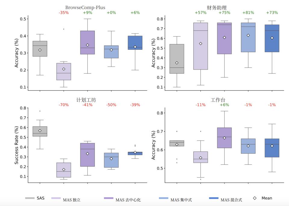 但值得注意的是,唯独在金融分析这种任务中,多智能体带来了整体性的提升,尤其是中心式Agent架构,足足能提升81%的效果。