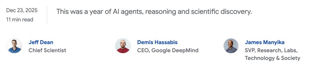 就在刚刚,谷歌AI掌门人们:首席科学家Jeff Dean、DeepMind CEO Demis Hassabis以及负责技术与社会的SVP James Manyika三位重量级人物联名发布了谷歌2025年度总结。