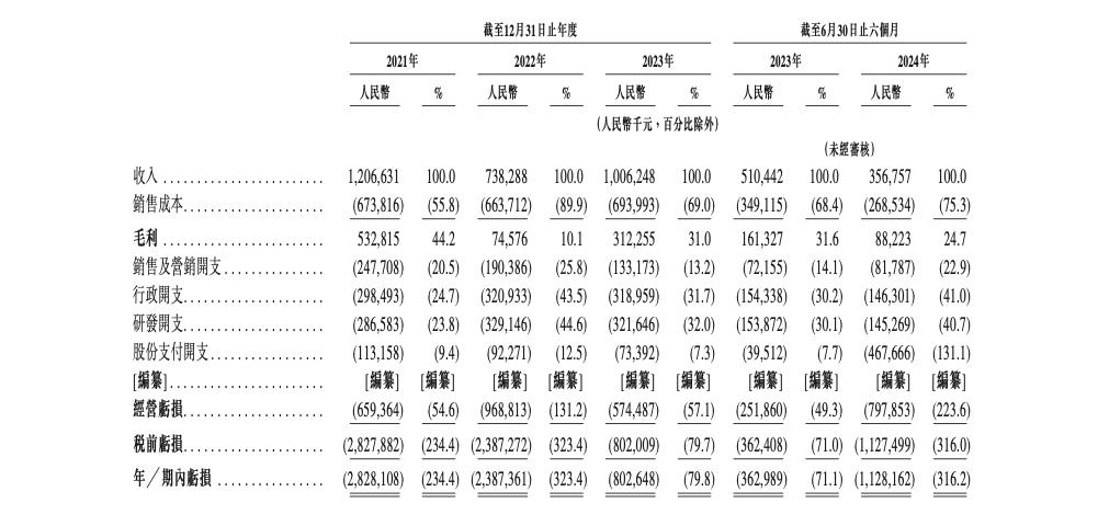 报告期内,特斯联的收入分别约为12.07亿、7.38亿、10.06亿、3.57亿;毛利分别约为5.33亿、7457.6万、3.12亿、8822.3万元,毛利率分别为44.2%、10.1%、31.0%、24.7%;期内亏损分别约为28.28亿、23.87亿、8.03亿、11.28亿元;经调整净亏损(非国际财务报告准则计量)分别约为6.39亿、9.83亿、6.00亿、3.56亿元。