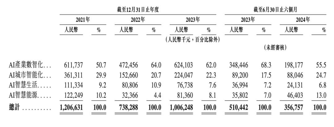 招股书显示,AI产业数智化与AI城市智能化是特斯联的两大主要营收来源,上述两项在2021-2023年及今年前6个月(下称:报告期)的收入占总收入的比例为50.7%、64.0%、62.0%、55.5%;29.9%、20.7%、22.3%、24.7%。