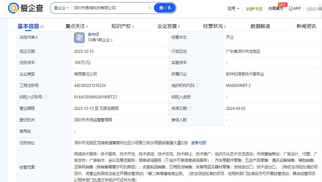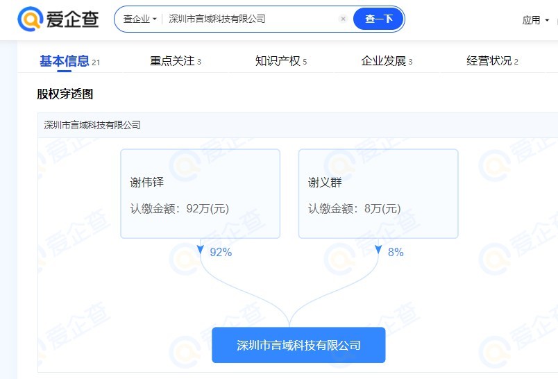 爱企查App显示,“Reecho睿声”关联公司——深圳市言域科技有限公司成立于2023年12月,注册资本100万元,法定代表人、执行董事及经理均为谢伟铎,公司经营范围包括网络技术服务、第二类增值电信业务、通讯设备销售、技术服务、技术开发、技术咨询等。股东信息显示,该公司由谢伟铎、谢义群2名自然人股东共同持股,持股比例分别为92%、8%。