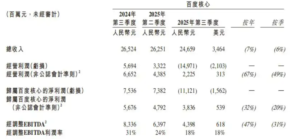 Q3财报数据显示,百度公司当季总收入312亿元,同比下降7%;季度净亏损112.3亿元,与去年同期76亿元的盈利形成鲜明反差,而曾作为“现金牛”的在线营销收入更是降至153亿元,同比下滑18%,核心搜索广告收入跌幅更是扩大至19%。