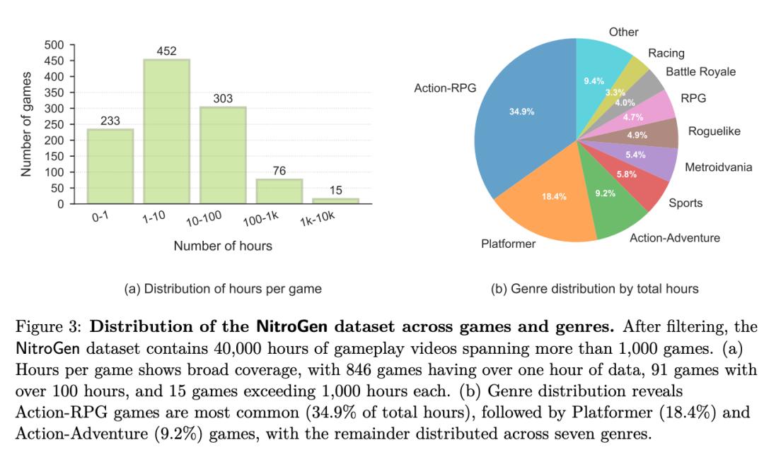 英伟达利用这一技术,构建了包含40,000小时、覆盖1000多种游戏的NitroGen数据集。