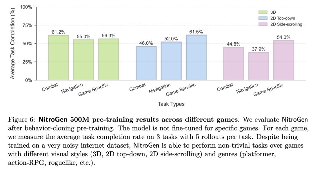 测试数据显示,当把NitroGen丢进一款它从未见过的新游戏里时,它的表现比那些从零训练的模型强了52%。