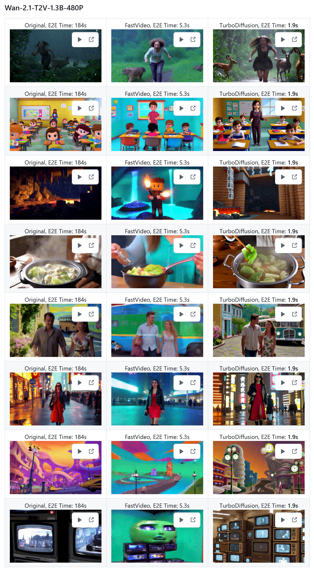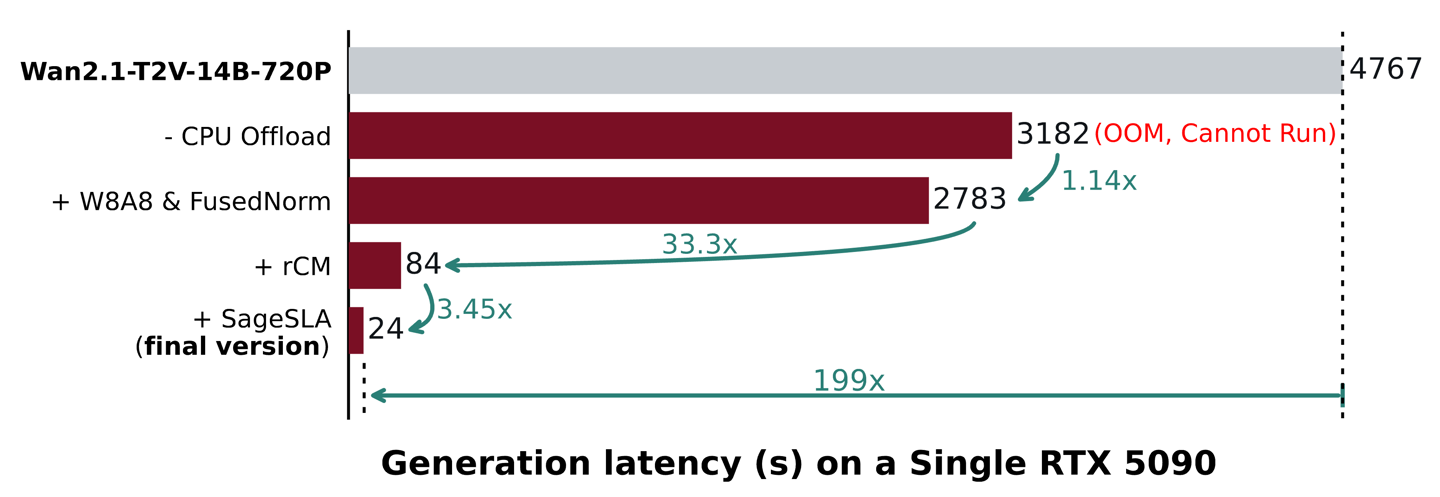 GitHub 页面公布的实测数据展示了惊人的性能跃升。在单张 RTX 5090 显卡上测试 Wan-2.1-T2V-1.3B-480P 模型,生成 5 秒视频的原版耗时为 184 秒,而 TurboDiffusion 仅需 1.9 秒。