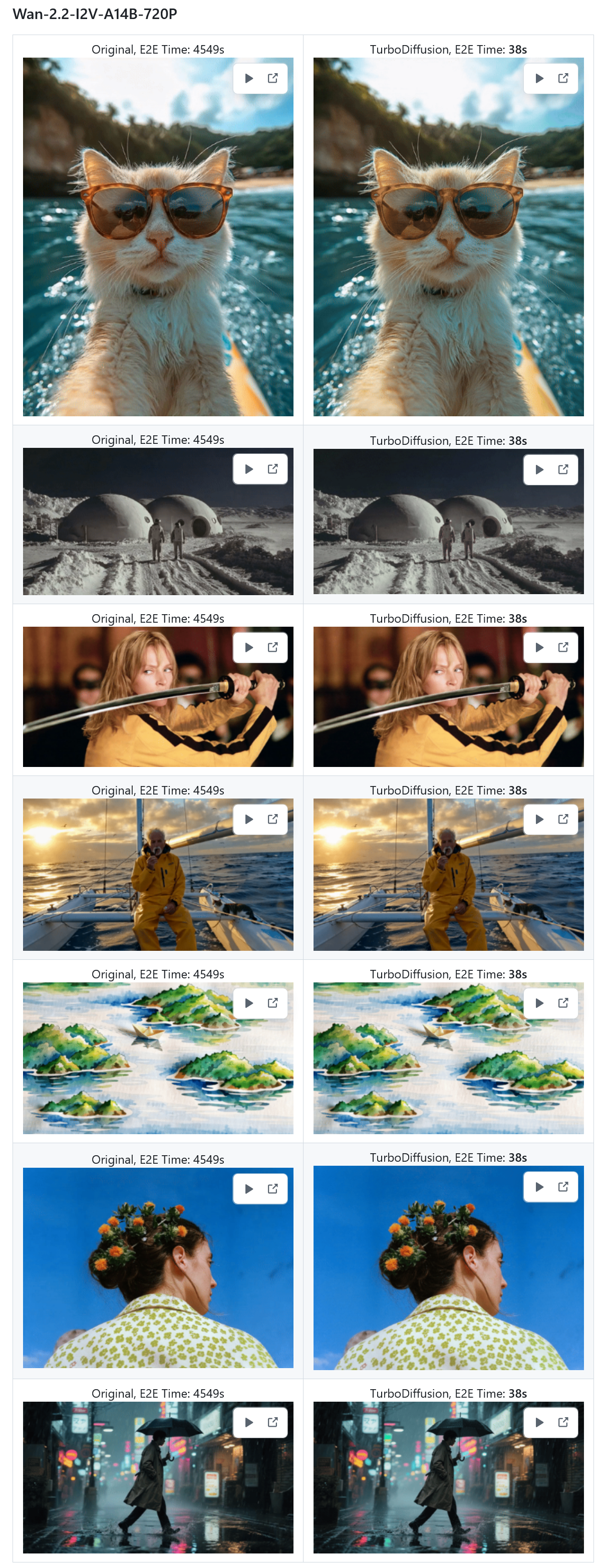 对于参数量更大的 Wan-2.2-I2V-A14B-720P 模型,原版生成耗时高达 4549 秒(约 1.2 小时),TurboDiffusion 将其压缩至 38 秒。IT之家附上相关截图如下: