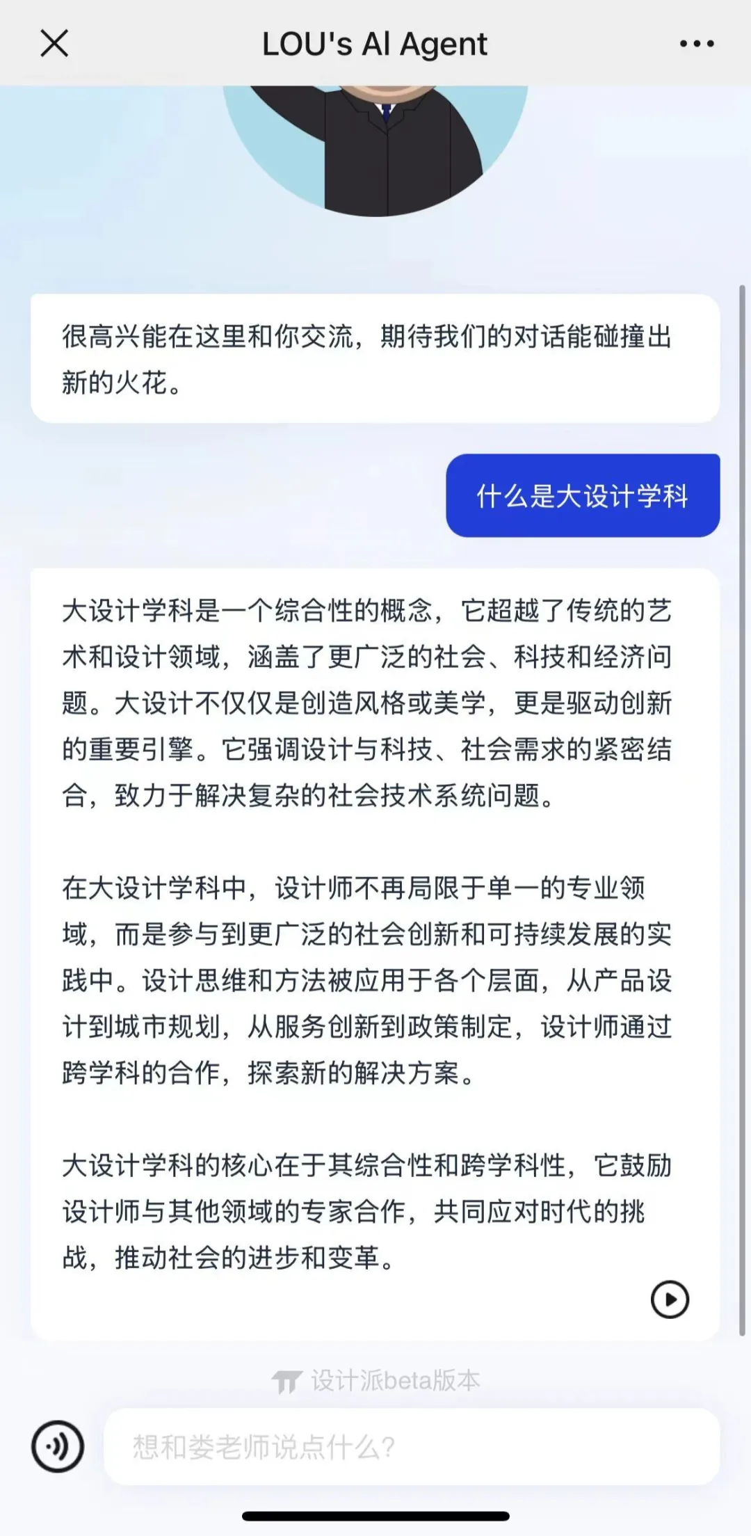 该行动的目的,是打造设计领域首个拉通学科和产业全链路的设计大模型生态;连接设计院校、专家、产业和消费者;助力实现大规模、个性化的教学科研与产业创新。双方合作的初步尝试是“大学教授 AI 智能体”Prof.Lou,其能够回答各种设计相关的专业问题。