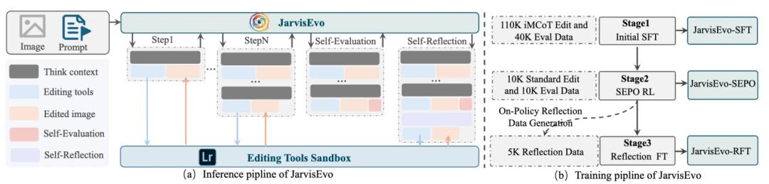 “像专家一样思考,像工匠一样打磨”。JarvisEvo不仅能用Lightroom修图,更能“看见”修图后的变化,并自我评判好坏,从而实现无需外部奖励的自我进化 。