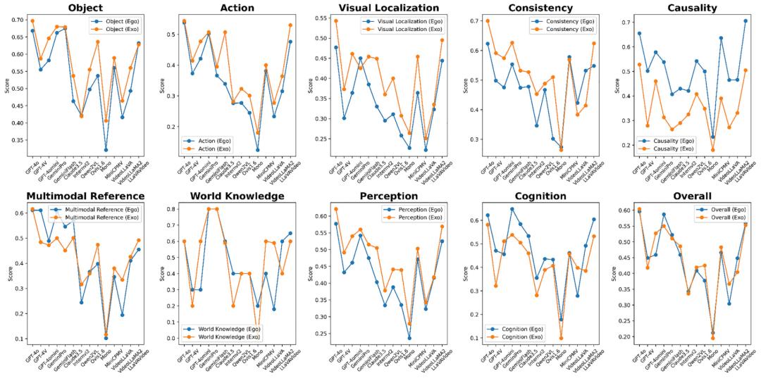 视角偏好:几乎所有模型在第三人称(外视角)视频上的表现都系统性优于第一人称(自我视角)视频。研究者分析,这可能是因为第一人称视频存在更多运动模糊、视角突变和遮挡,对模型的动态感知提出了更高要求。