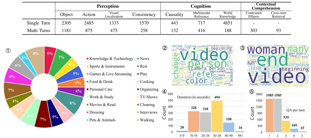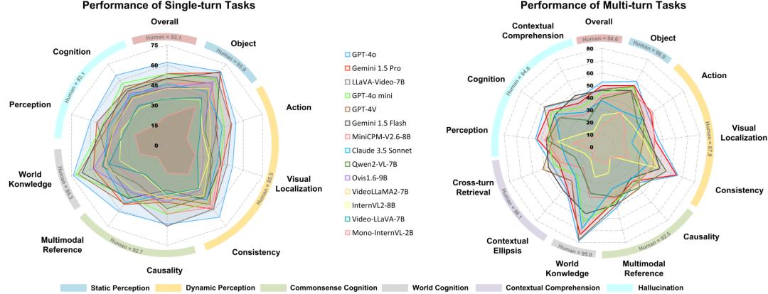 更重要的是,它引入了多轮对话评测(最多5轮),要求模型具备连贯的上下文理解、信息关联与指代消解能力,这是此前视频评测中普遍缺失的一环。