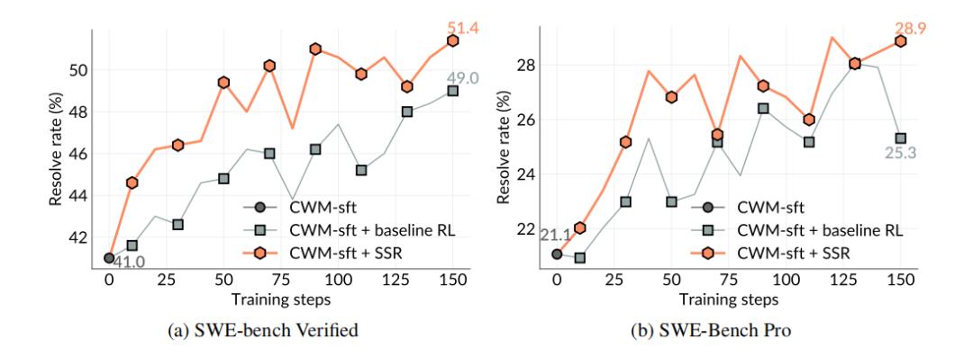 研究人员在 SWE-bench Verified 与 SWE-bench Pro 上,对基础模型、基线强化学习方法以及 SSR 进行了系统比较。