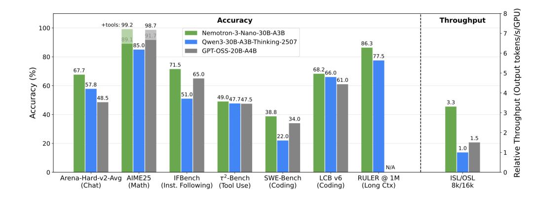 在8k输入、16k输出的典型推理场景下,Nemotron 3 Nano 30B-A3B的吞吐量是Qwen3-30B-A3B的3.3倍。序列越长,优势越明显。