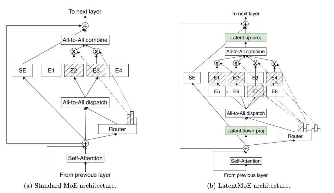 针对Super和Ultra这两个更大的模型,英伟达提出了LatentMoE架构,在潜在空间中进行专家计算。