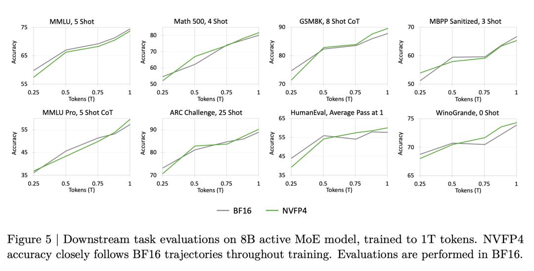 在MMLU、GSM8K、HumanEval等下游任务上,NVFP4训练的模型与BF16版本的准确率曲线几乎完全重合。