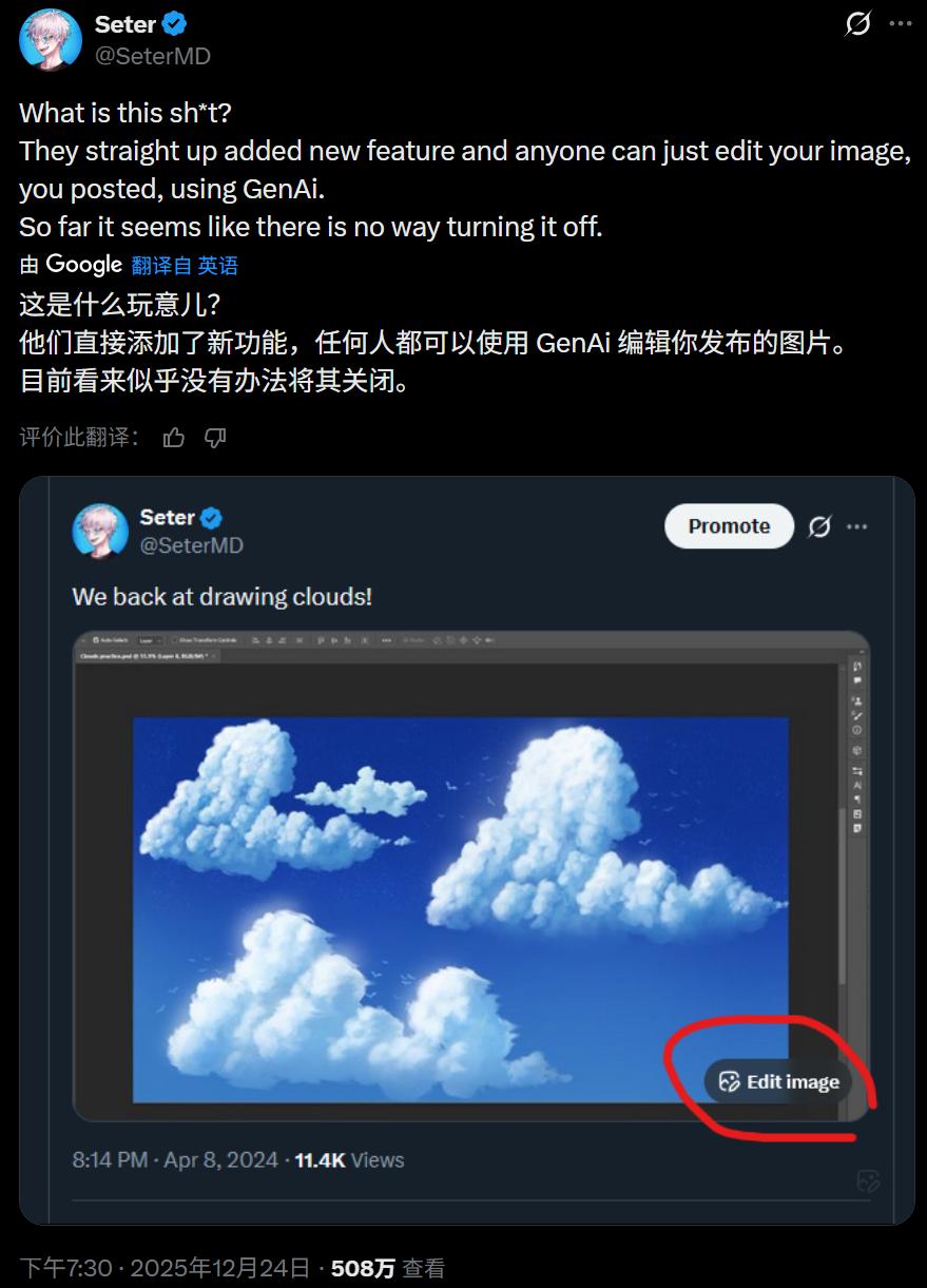 不过对于那些以作画为生的创作者来说,马斯克发布的新功能,就像一个噩耗。毕竟你辛苦画出来的作品,发到 X 上之后,底下可能就是一串 AI 改图的回应。这怎能不让人破防。