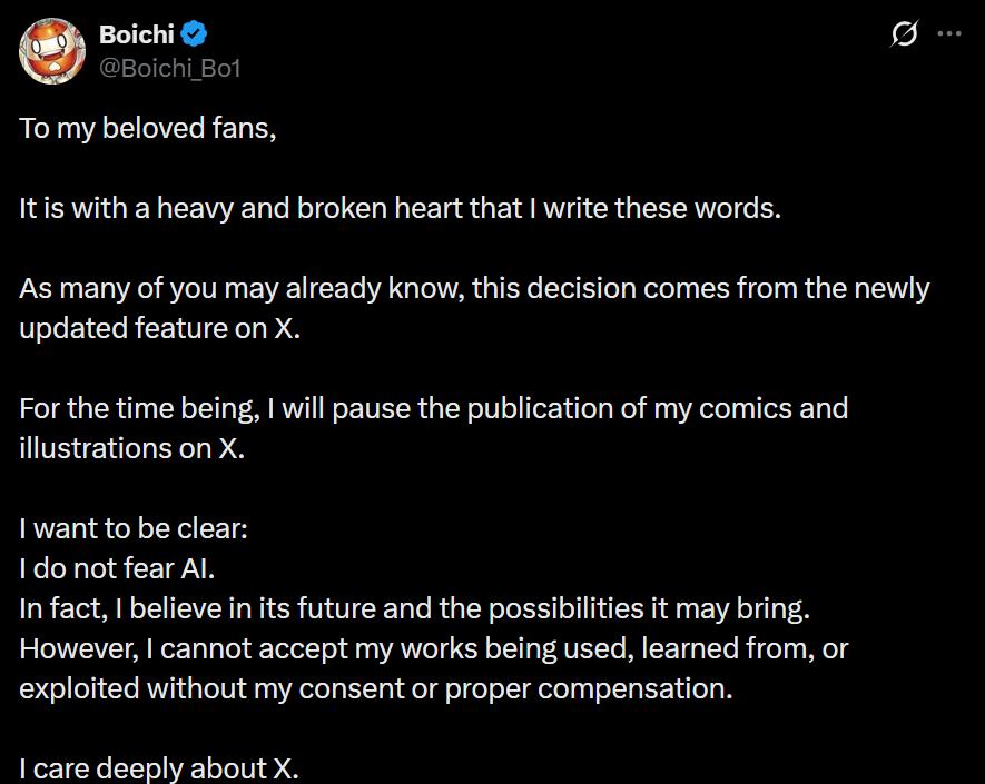 抗议的人中也包括一些有名的画师,比如《石纪元》的作者 Boichi,他表示,虽然他很喜欢 X 平台,因为这个活跃的平台能让他与粉丝互动,但他不能在未经他同意或未获得报酬的情况下,将自己的作品发布到该平台上,并允许他人使用、学习或利用这些作品。