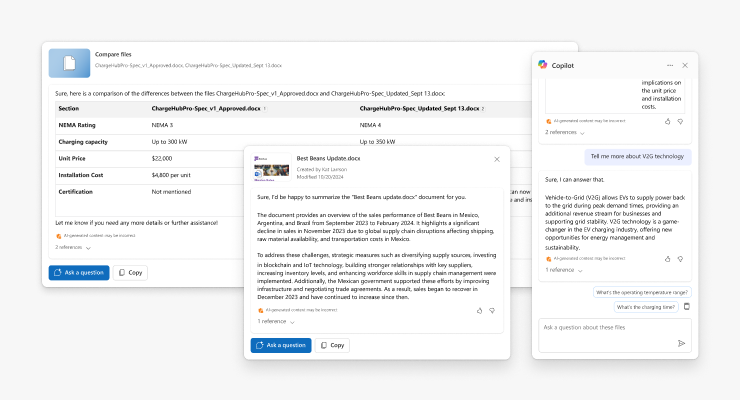 Copilot 能够分析 OneDrive 中的文件内容,回答来自多个文档的复杂问题,将文件存储转变为知识和洞察的宝贵来源。
