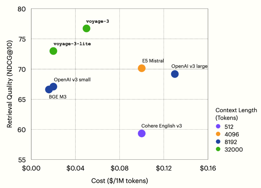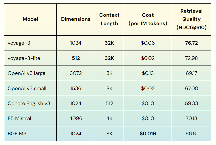 此外,Voyage-3 较小的嵌入维度(1024 对比 OpenAI 的 3072),因此实现更低的向量数据库成本,让公司能够有效扩展应用程序。
