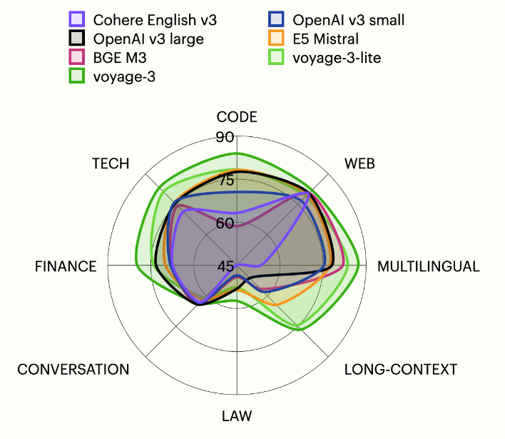 IT之家援引 Voyage AI 官方数据,在技术文档、代码、法律、金融、网页内容、多语言数据集、长文档和对话数据等方面,Voyage-3 以 1/2.2 更低成本、1/3 更小嵌入纬度,显著降低了向量数据库(vectorDB)的成本,且综合跑分超越 OpenAI 的 v3 Large 模型 7.55%。