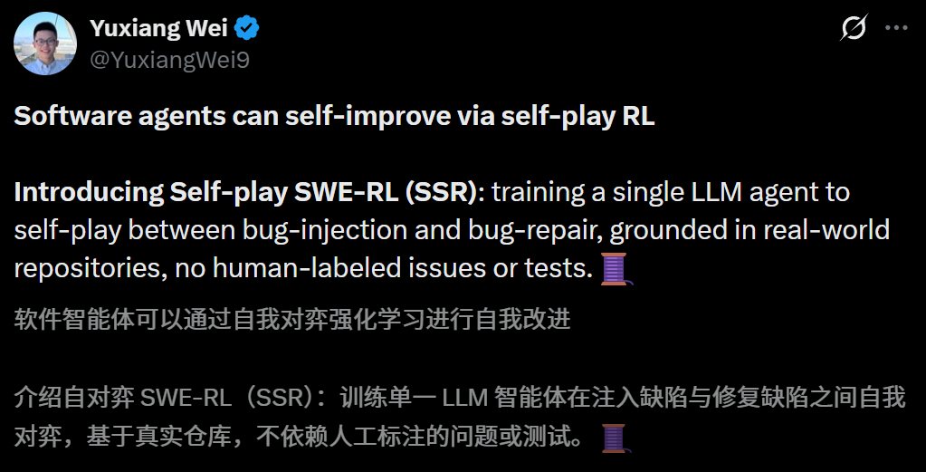 就在最近,来自Meta、UIUC和CMU的研究团队,凭借最新成果Self-play SWE-RL(SSR),正在试图复刻AlphaZero的神话——