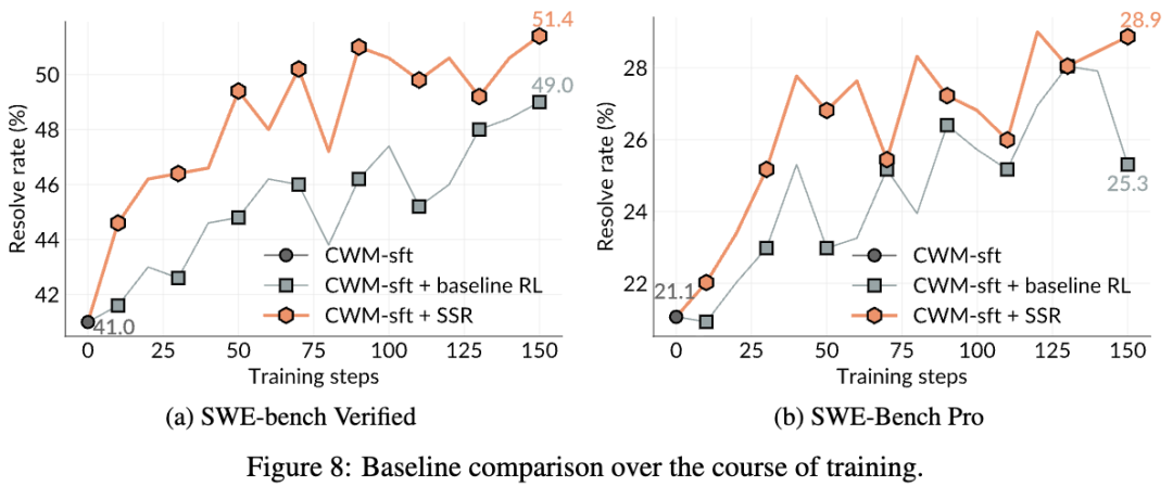 零样本泛化:SSR在训练时从未见过任何自然语言描述的Issue,它只看过代码和测试。但在测试时,它却能完美处理带有Issue描述的任务。这说明它学到的不是「做题技巧」,而是真正的「编程内功」。