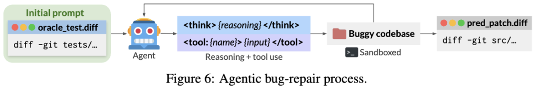修复者拿到的任务非常具有挑战性,它看不到那个原始的Bug是怎么注入的,它必须像一个侦探一样,通过阅读代码、运行测试、分析报错,最终写出一个修复补丁(Fix Patch)。