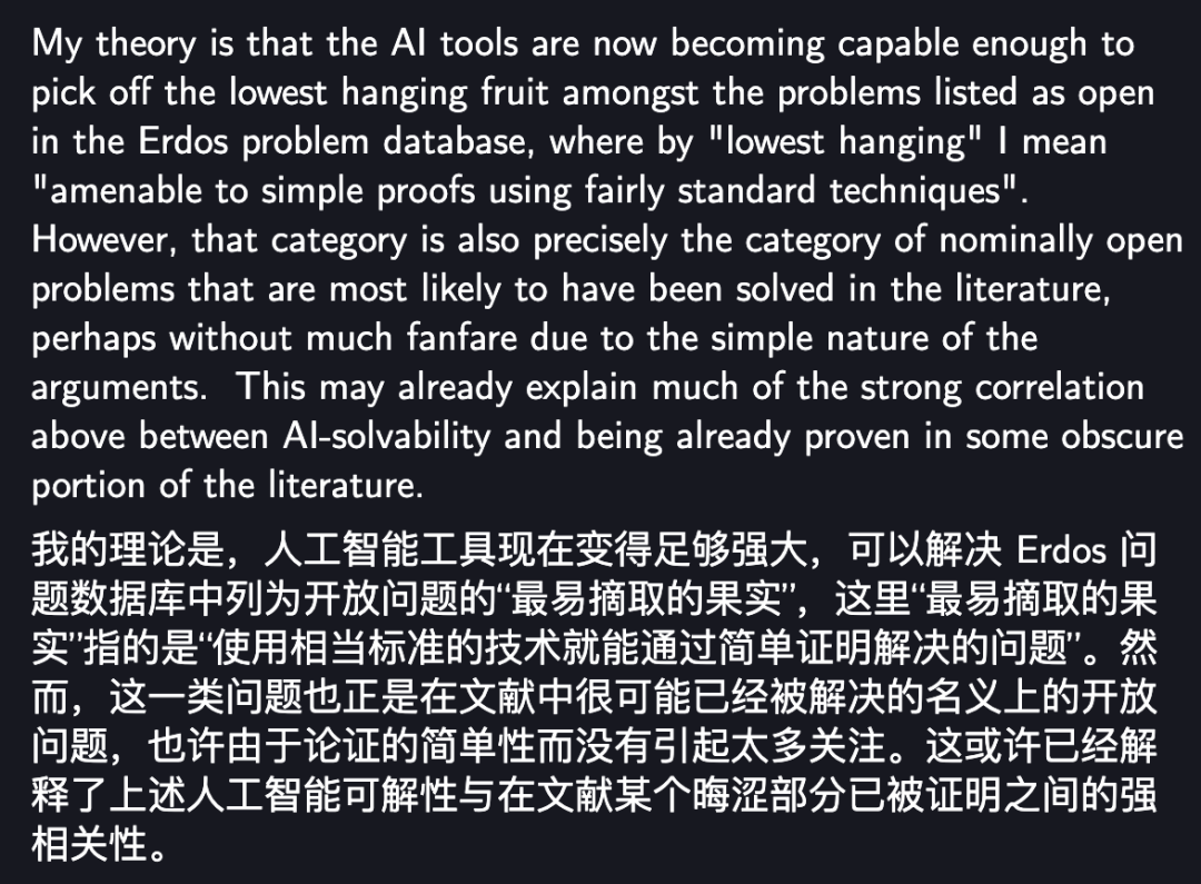 我的理论是,人工智能工具现在变得足够强大,可以解决 Erdos 问题数据库中列为开放问题的「最易摘取的果实」。