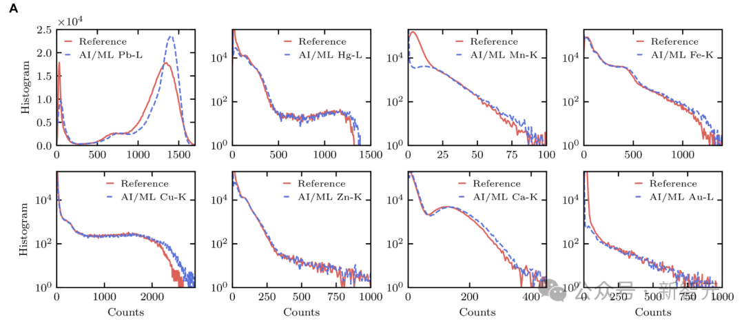 从图 3-5 的元素分布图,以及图 7 的量化结果中可以看出,模型的预测结果与参考值匹配程度很高,元素净计数也遵循相同的分布。