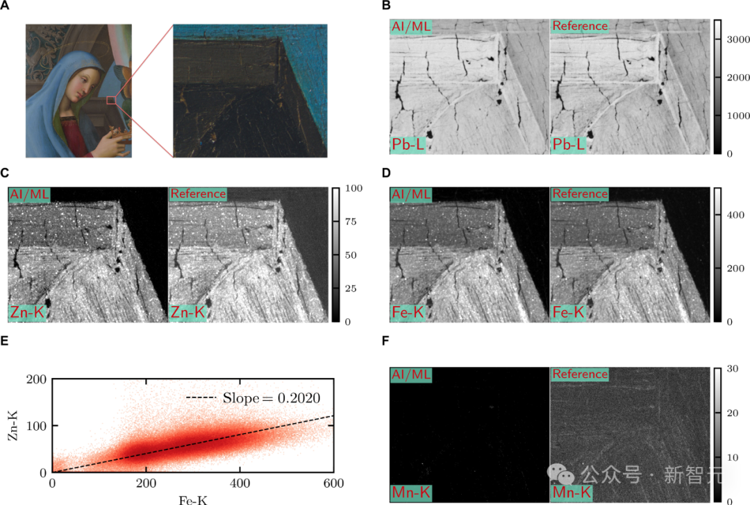 图 5B 则能让我们更精细地看到拉斐尔如何用铅勾勒出建筑的细节,此外,铁元素和锌元素含量的显著线性关系(图 5E)则能告诉我们,他使用的赭石中包含大量锌元素。