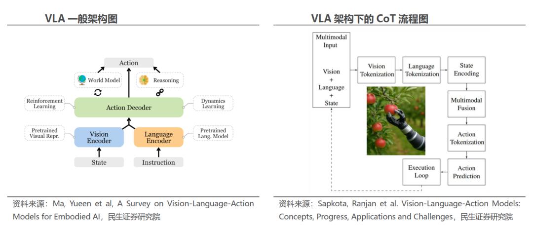此时就要进一步引入VLA 大模型,即Vision(视觉)、Language(语言)、Action(动作),可以从能够输出动作指令,升级到能够思考为什么要输出相应的动作指令。国内企业理想、小鹏均布局了该技术领域,并积累了一定技术储备。