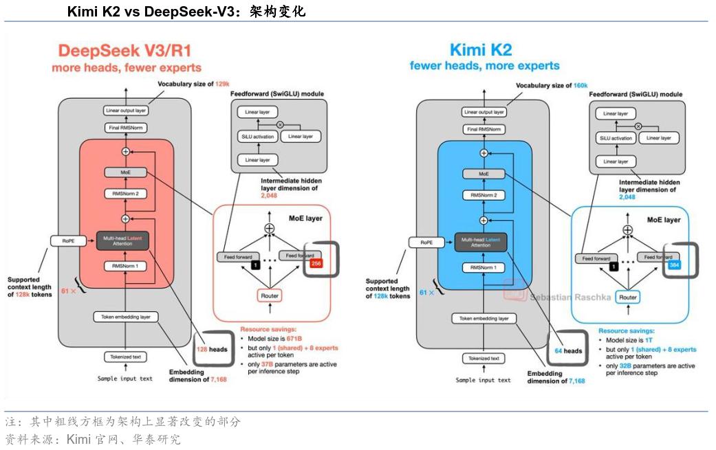 DSV3框架的成功,令很多模型在DeepSeek V3框架引入针对性架构优化,如Kimi K2,K2主要改进包括验证在激活参数不变的条件下,单纯提升MoE总参数量依然符合Scaling规律,训练与验证loss持续下降且无过拟合迹象;适度减少Attentionhead数量,在保持性能稳定的同时显著降低算力开销;仅保留首层dense层,其余全部采用MoE结构,以改善首层router负载不均并提升专家利用效率;引入无分组的简化router,优化计算路径与参数调度;将模型参数从V3的671B提升到1T;引入MuonClip优化器,显著提升训练稳定性与收敛一致性。