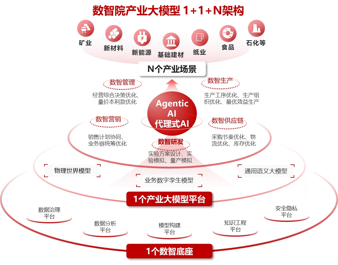 正是凭借这份在工业领域独有的“产业数据+业务逻辑+工业机理”的工业Know-how能力,数智院打造了一套成体系的“1+1+N架构”,它由一个数智底座、一个产业大模型平台、N个代理式AI应用组成——水泥与建材只是其中一个领域。目前正逐步拓展至新能源、新材料、纸业、粮油、矿业、石化等多个行业,推动形成跨行业、跨场景的智能协同新范式,系统构建面向未来的产业智能生态。