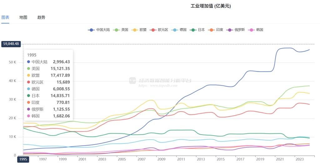 1995-2024年中、美、欧、德、日、印、俄、韩各国工业增加值变化;图片来源:经济数据智能分析平台