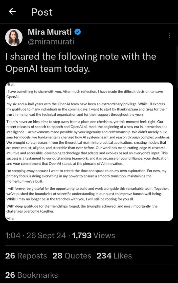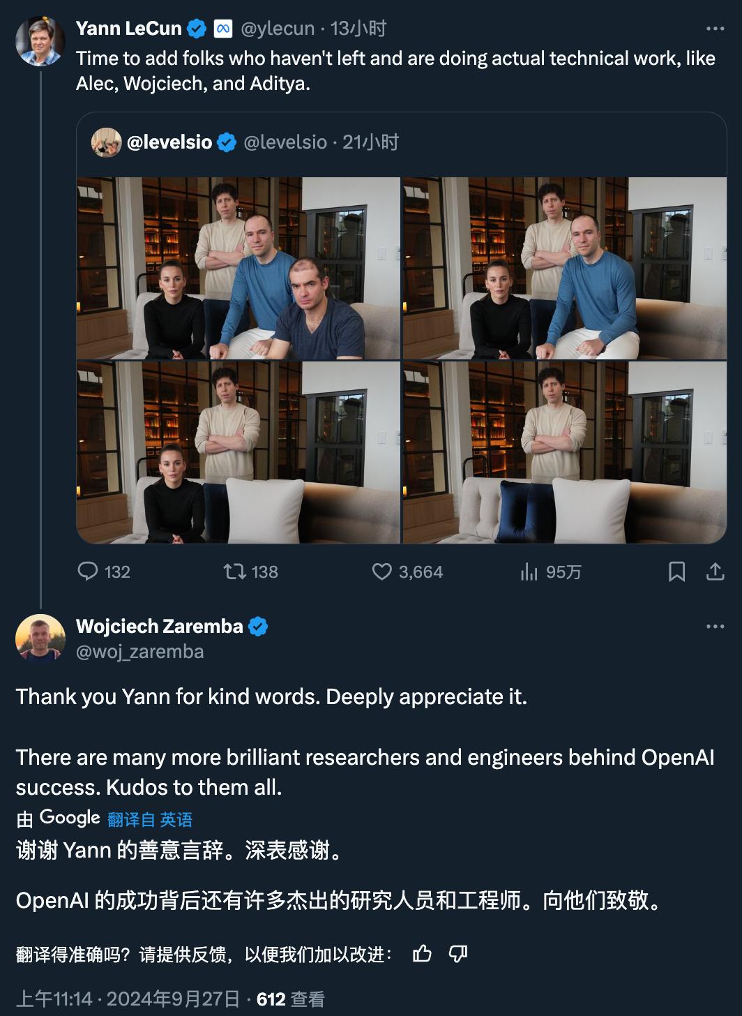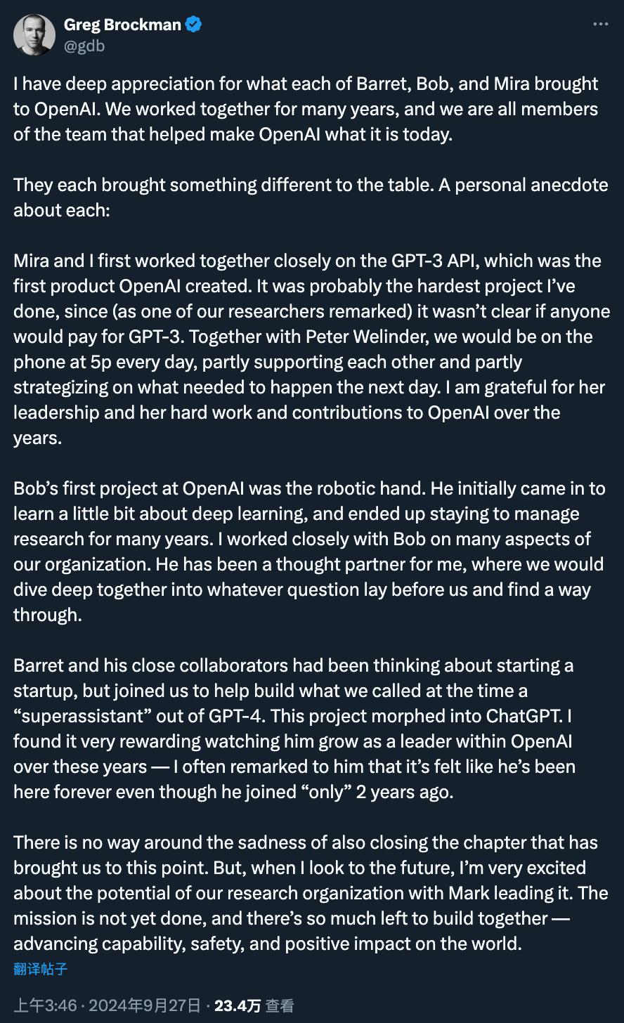 我对 Barret、Bob 和 Mira 为 OpenAI 所做的贡献深表感激。我们合作多年,我们都是帮助 OpenAI 走到今天的团队成员。