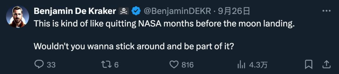 「问题是:为什么关键人物会在组织即将开发 AGI 之前离开?」在 Murati 宣布离职后不久,xAI 开发人员 Benjamin De Kraker 问:「这有点像在登月前几个月离开 NASA,你不想留下来并成为其中的一员吗?」