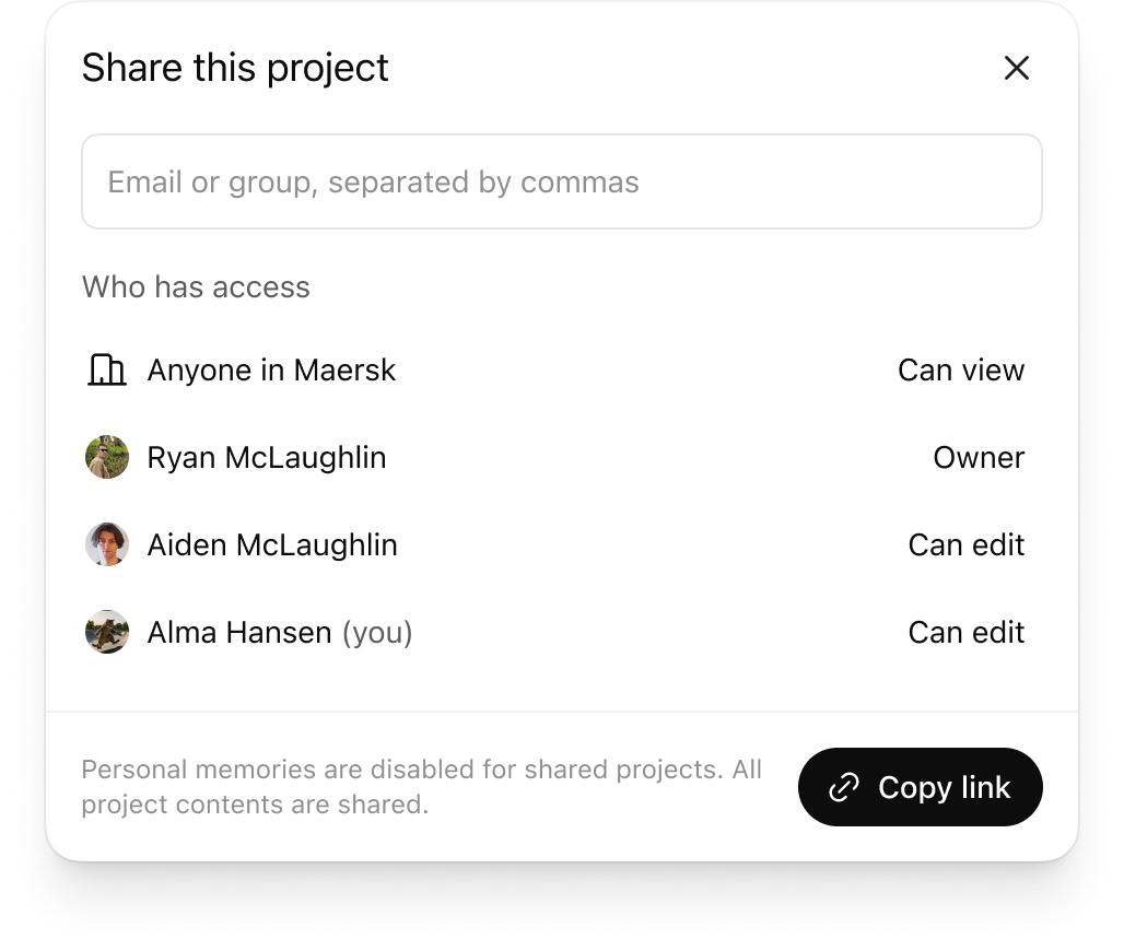 共享项目允许分配成员权限(仅查看对话或可编辑项目设置),确保协作安全可控。这一系列功能将ChatGPT变成了一个协作工作空间,满足小组交流、资料共享、共同创作的需求,朝着社群型工具更进一步。