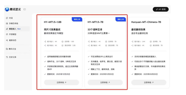 【CNMO科技消息】12月30日,腾讯官方宣布开源其混元翻译模型1.5版本,包含Tencent-HY-MT1.5-1.8B和Tencent-HY-MT1.5-7B两款模型,支持33种国际语言互译及5种民汉/方言翻译,覆盖捷克语、马拉地语、爱沙尼亚语、冰岛语等小语种。两个模型已在腾讯混元官网、GitHub及HuggingFace平台上线,供开发者免费下载使用。