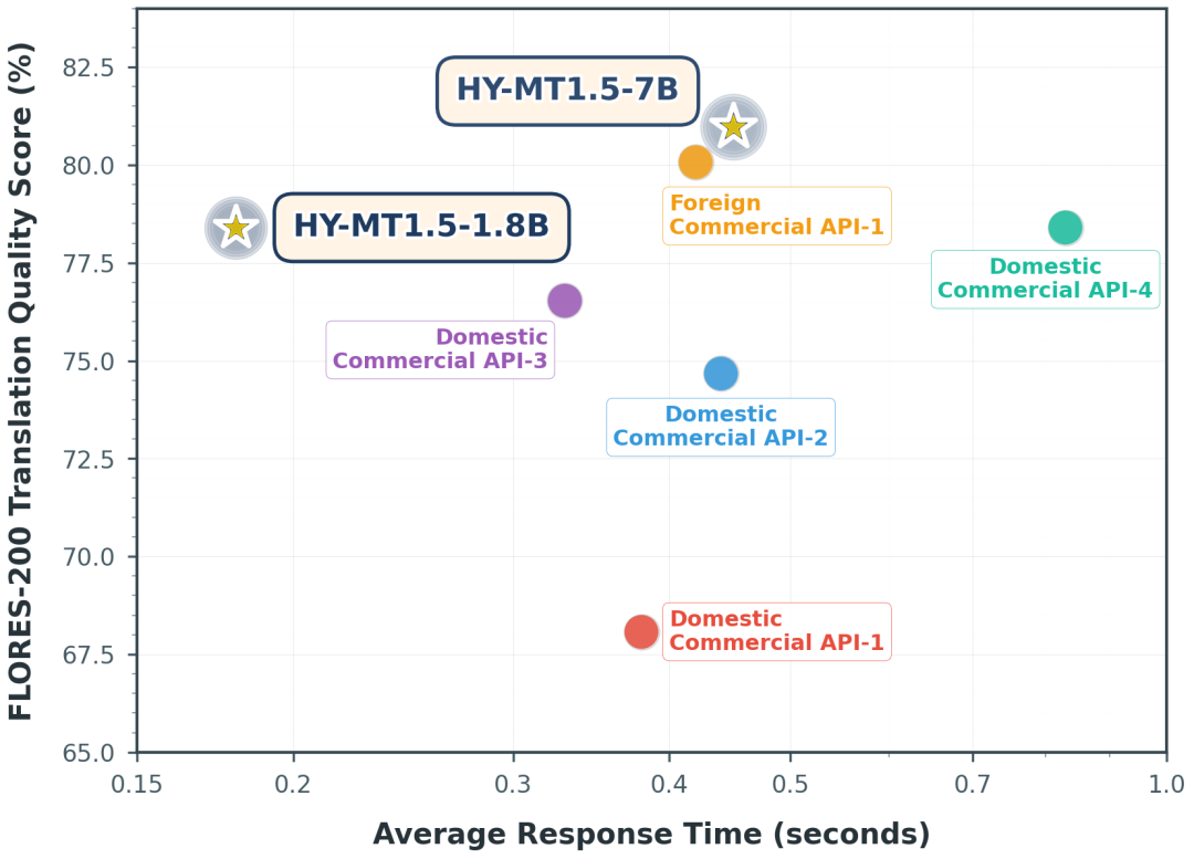 HY-MT1.5-1.8B 模型在 FLORES-200 质量评估中取得了约 78% 的分数,同时平均响应时间 0.18 秒,超越主流商用翻译 API,适用于即时通讯、智能客服、移动翻译应用等高吞吐、实时翻译场景。