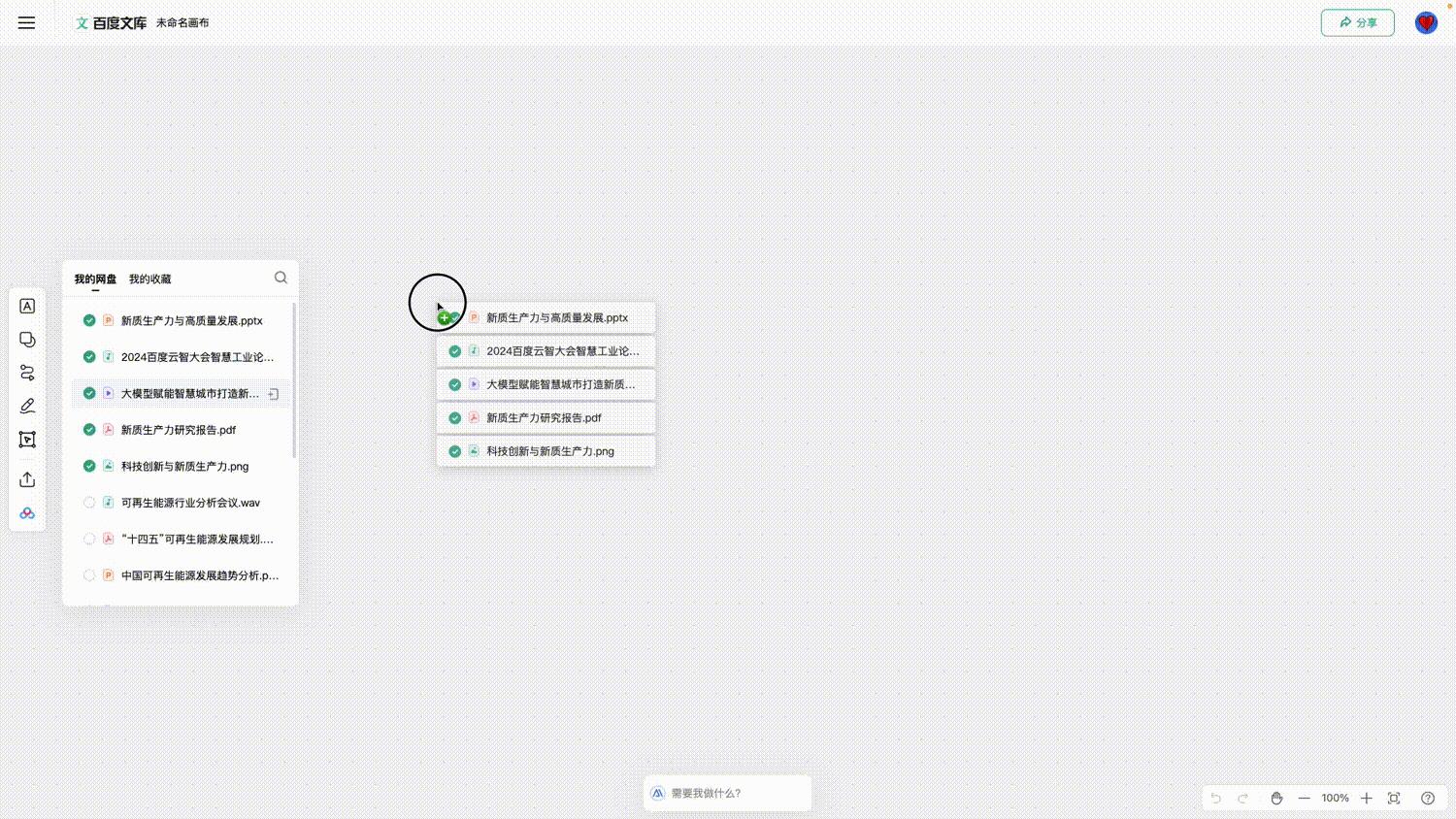 百度文库与百度网盘联合推出的“自由画布”,彻底摒弃了“面向文件格式”的设计逻辑,而是面向创作场景设计,让用户可实现跨文件格式的内容编辑,一站式存储、分享、整理与处理图片、文字、PPT、PDF、EXCEL、声音、视频等内容,且可实现互相转化与最终内容输出。