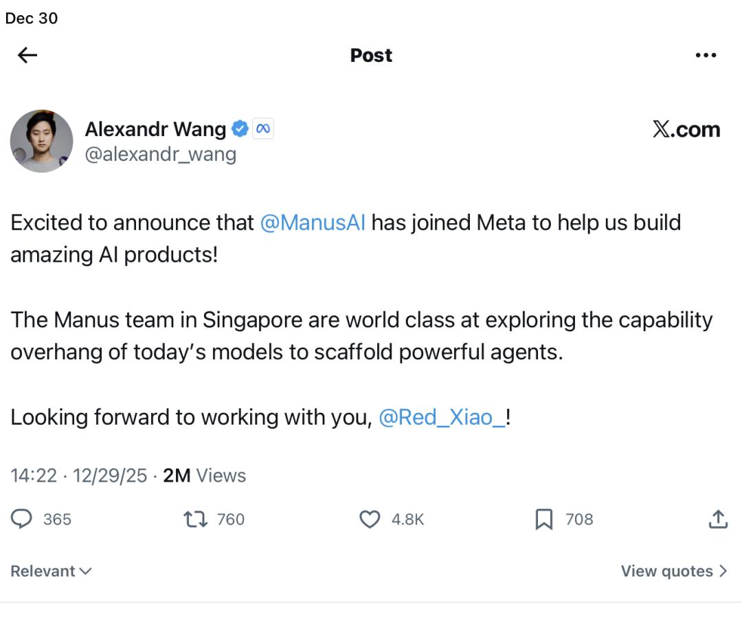 Meta的AI业务负责人亚历山大·王(Alexandr Wang)昨天在社交媒体上宣布,Manus已经加入Meta,期待与Manus联合创始人兼CEO肖弘一道打造出色的AI产品。他称赞,Manus团队在探索当今模型的过剩能力方面处于世界一流水平,能够构建强大的AI代理。