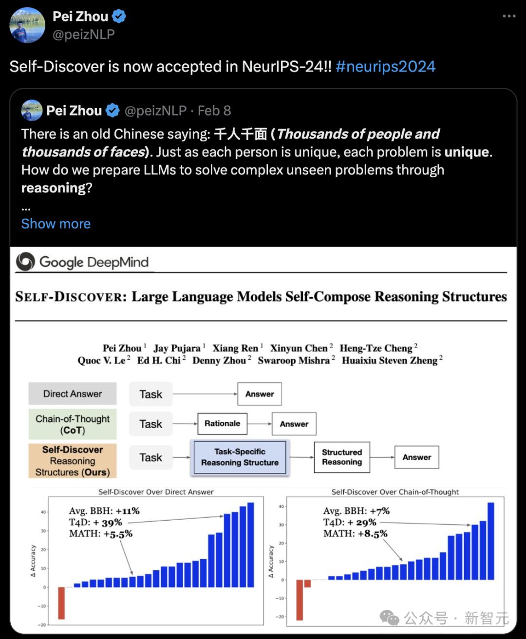 谷歌DeepMind团队Self-Discover算法被NeurIPS 2024录用。