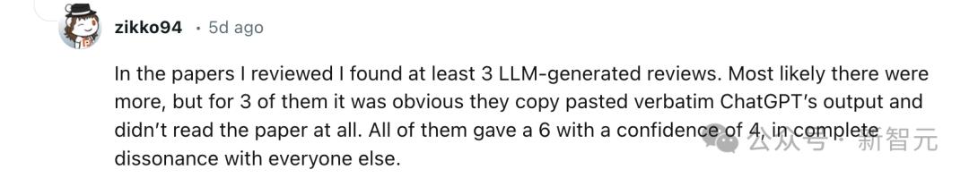 还有人指出,在自己审阅的论文中,至少发现了3篇由大模型生成的评审意见,很可能还有更多,其中3篇明显是直接复制粘贴了ChatGPT输出,完全没有阅读论文。