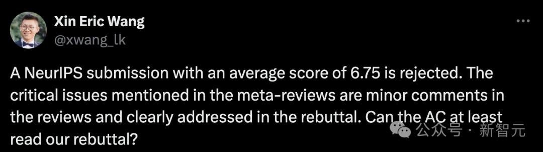 一位UCSC教授Xin Eric Wang表示,一篇平均得分为6.75的NeurIPS投稿被拒绝了。