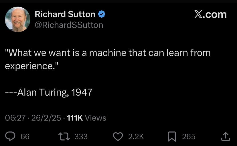 这与强化学习教父Richard S. Sutton分享的观点类似。