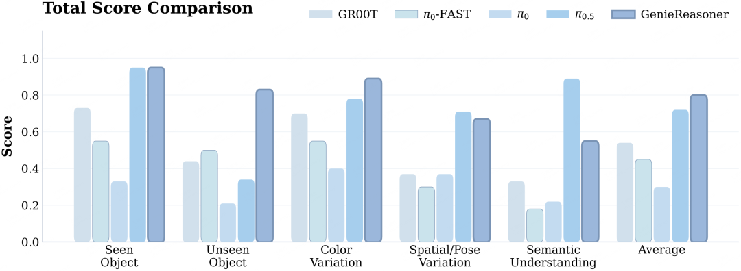 实验表明,GenieReasoner 不仅在推理能力上达到 SOTA,更在跨本体真机实验中展现了 SOTA 级别的泛化性。进一步的对比实验证实:VLA 模型更强的具身推理能力可显著提升其端到端动作执行表现,从而验证了 ERIQ 的评估价值。