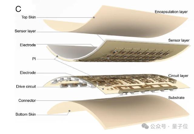 在将触觉信息编码为脉冲信号后,NRE-skin借鉴人类皮肤的分层处理,设计了四层结构(封装层、传感层、电路层、基底层) 。