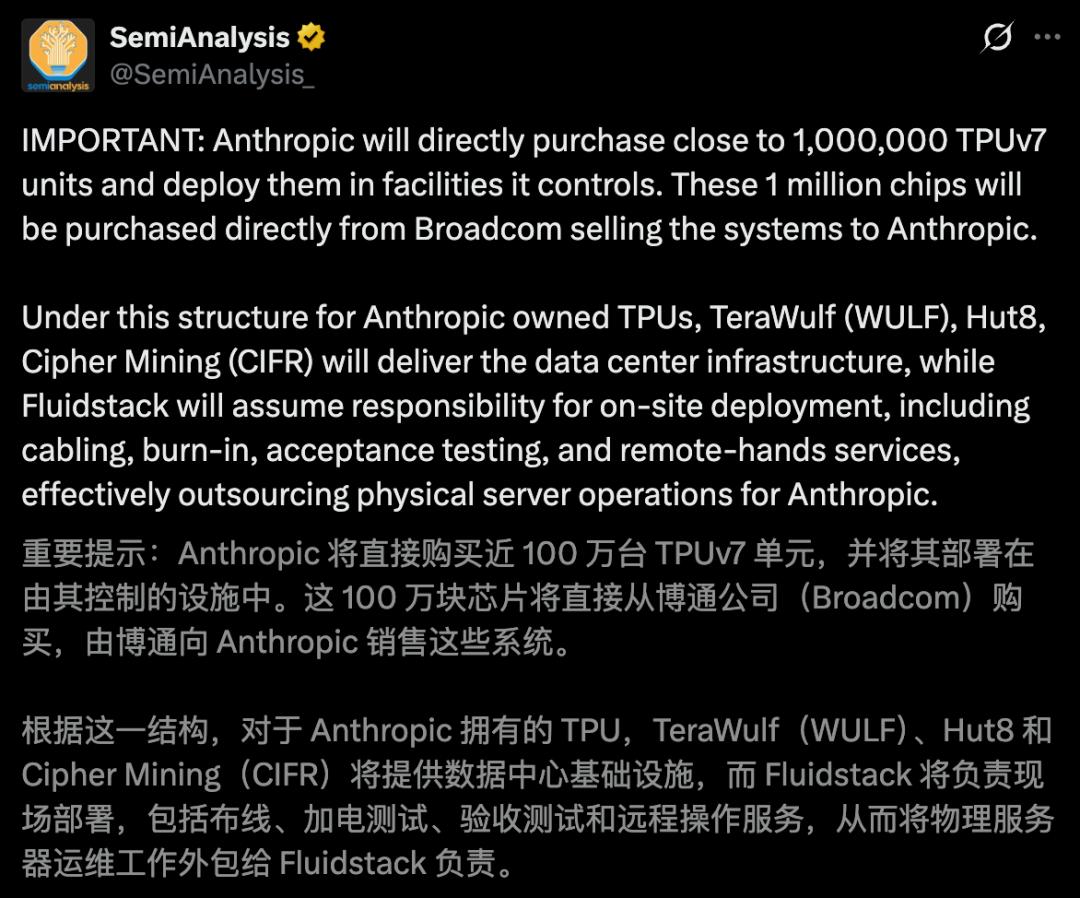 Anthropic持有TPU的所有权,基础设施部分交给了TeraWulf、Hut8和Cipher Mining合作伙伴来提供。