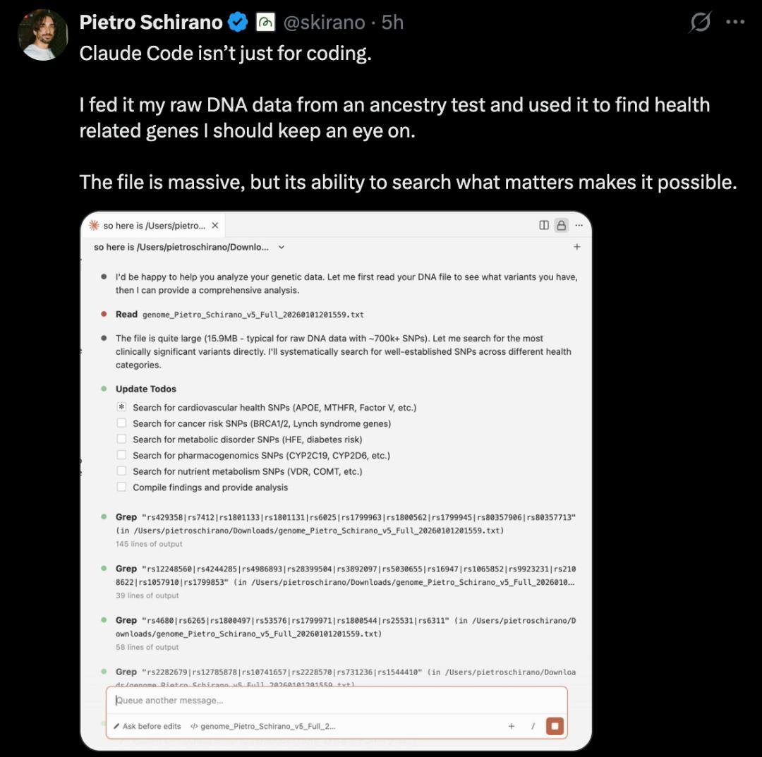 不仅如此,Claude Code不仅适用于编程,Pietro Schirano还将原始DNA数据输入,并利用它找出了一些与健康相关的基因。
