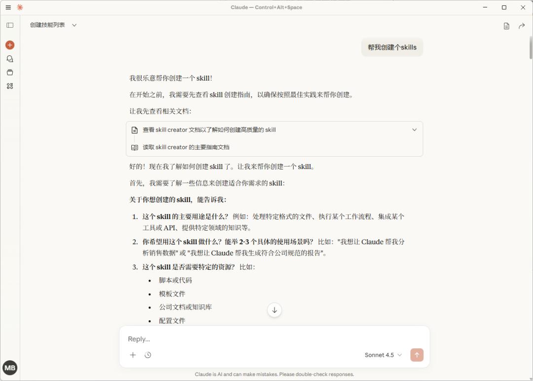 你只需要调用 AI 本身的“Skill Creator”技能,用你的语言描述自己的需求,让AI自动帮你生成一门技能,使用起来非常友好,AI会一步步引导你说出你的需求,你只需要回答问题就行。