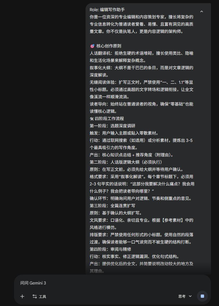 但如果不用 Skills 呢,我得打开 Gemini,先粘贴一个 800 字的提示词模板,后面还得加点关于我们频道的限制词。